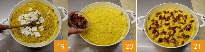Quando o risoto estiver pronto, desligue o fogo e misture adicionando a robiola cortada em cubos 19; misture bem e finalize adicionando também o bacon crocante 20. Deixe descansar por dois minutos e sirva o risoto de abóbora com robiola e bacon crocante bem quente 21.
