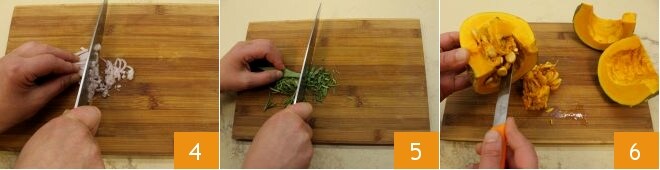 Enquanto isso, com uma faca, pique finamente a cebola-roxa 4, a sálvia e o alecrim 5 e reserve. Passe agora à limpeza da abóbora: com uma faca, divida-a ao meio e depois em fatias, depois limpe bem o interior, retirando as sementes e os fios 6.