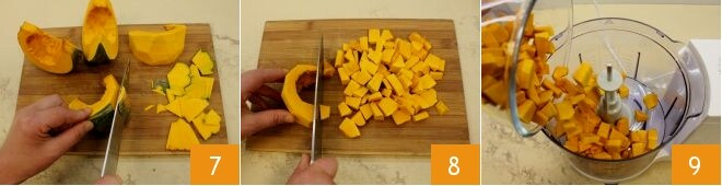 Após remover a casca 7, corte a polpa em cubos de cerca de 2 cm 8 e coloque os cubinhos de abóbora que você obteve em um processador de alimentos 9.