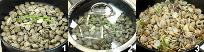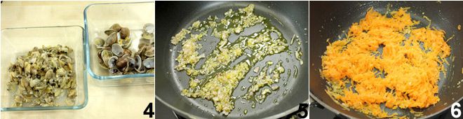 Para preparar o risoto de cenoura, gengibre e amêijoas, primeiro prepare o óleo de gengibre aquecendo levemente duas colheres de sopa de azeite com 10 gr. de gengibre limpo e fatiado finamente. Deixe descansar por um dia antes de coar. Em seguida, abra as amêijoas. Coloque-as em uma frigideira (após terem sido bem limpas) com um dente de alho e um talo de salsa sem as folhas 1, cubra a frigideira com uma tampa 2 até que as amêijoas se abram 3.