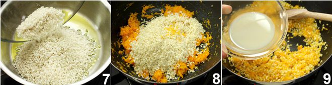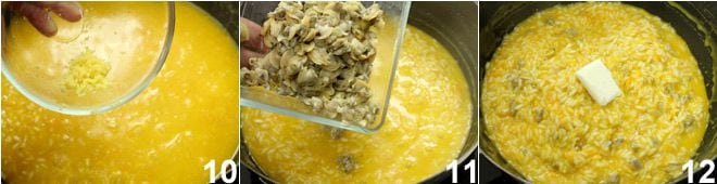 Toaste o arroz em uma panela 7 à parte e quando estiver pronto, adicione-o às cenouras 8 molhando tudo quando necessário com o caldo de legumes 9 misturado com a água das amêijoas, sal e pimenta.