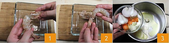 Para preparar o risoto de camarões, primeiro limpe os camarões, removendo a cabeça 1 e a casca, descascando até a cauda 2. Separe os camarões das cascas, que você reservará para preparar o caldo. Lave e limpe bem os legumes para o caldo, corte-os em pedaços e refogue-os, em fogo médio, em uma panela grande, com um fio de óleo 3.