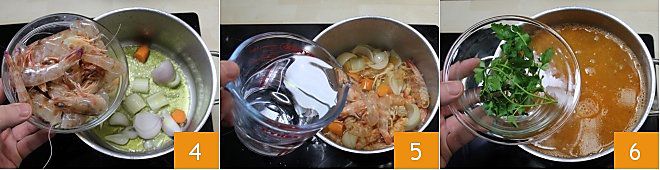 Adicione as cascas e as cabeças dos camarões 4, cozinhe por alguns minutos, pressionando as cabeças com uma colher de pau para liberar todos os sucos. Junte a água 5 e os ramos de salsa 6 e deixe ferver em fogo moderado. Se necessário, ajuste o sal a seu gosto.