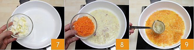 Enquanto o caldo cozinha, pegue uma frigideira antiaderente e derreta a manteiga 7 e refogue a cebola e a cenoura picadas finamente 8, com uma concha de água para amolecer os legumes 9.