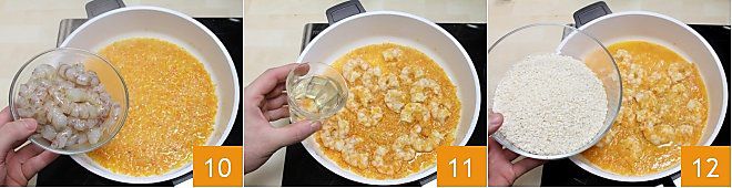 Assim que o refogado estiver pronto, adicione os camarões descascados 10, refogue-os em fogo alto; quando liberarem seu líquido, adicione o vinho branco e deixe evaporar 11. Abaixe o fogo e adicione o arroz, que você deixará tostar por alguns minutos 12.