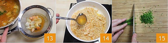 Enquanto isso, coe o caldo de peixe 13 e adicione-o, uma concha de cada vez, ao risoto 14. Cozinhe o arroz por cerca de 18 minutos em fogo moderado, adicionando mais caldo apenas quando o arroz absorver o líquido anterior. Durante esse tempo, pique finamente a cebolinha 15.