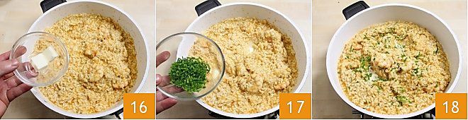 Após o cozimento, retire o risoto do fogo, adicione a manteiga e a cebolinha picada (16-17) e finalize o risoto. Sirva seu risoto de camarões imediatamente: bom apetite!