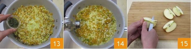 Adicione o picado ao risoto que está cozinhando 13. Ajuste o sal e a pimenta 14. Neste ponto, pegue as maçãs: lave-as e seque-as bem, depois corte-as ao meio e depois em fatias, removendo a parte central do caroço 15. Não é necessário remover a casca, pois ela dará cor à preparação. Se preferir, pode removê-la.
