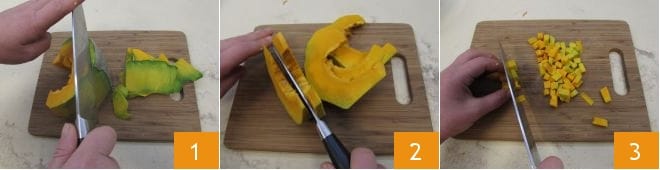 Para preparar o risoto de maçãs, abóbora picante e sálvia, comece preparando o Caldo de legumes. Depois, dedique-se à limpeza da abóbora: corte-a em quartos e retire a casca externa 1. Em seguida, corte-a em fatias 2 para depois reduzi-la a cubinhos de 1 cm 3.