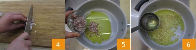 Depois, limpe e pique finamente o echalote 4. Aqueça uma panela com um fio de óleo e doure o echalote 5 por cerca de 5-6 minutos, mexendo continuamente. Você pode adicionar o caldo de legumes para ajudar no cozimento 6.