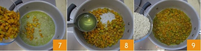 Acrescente a abóbora 7 e adicione uma concha de caldo 8: levará cerca de 15 minutos em fogo baixo, mexendo de vez em quando. Quando o caldo for absorvido, adicione o arroz 9 e deixe torrar por cerca de 1 minuto.