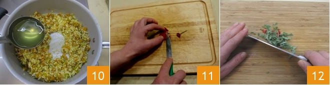 Depois, vá adicionando mais caldo de legumes à medida que for absorvido para cozinhar o arroz 10: levará cerca de 20 minutos. Enquanto o arroz cozinha, corte uma pimenta e remova as sementes internas 11, depois corte-a em tiras finas junto com a sálvia já lavada 12.