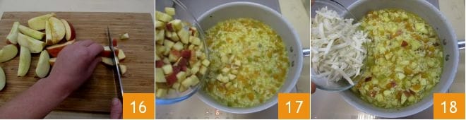 Em seguida, corte as fatias de maçã em cubos de cerca de 2 cm 16. Quando faltarem 5-6 minutos para o final do cozimento do risoto, adicione as maçãs 17 e misture bem os ingredientes. Continue adicionando o restante do caldo. No final do cozimento, desligue o fogo e adicione a ricota salgada ralada 18.