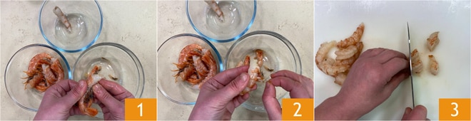 Para preparar o risoto com lentilhas vermelhas e camarões, a primeira coisa a fazer é dedicar-se à Como limpar os camarões. Retire a cabeça, a carapaça 1 e o intestino 2, em seguida corte-os em 3 pedaços 3.