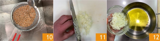 Lave bem as lentilhas em água corrente 10. Pique finamente a cebola 11. Em uma panela, adicione o óleo, acrescente a cebola 12 e deixe refogar em fogo baixo por 6-7 minutos.
