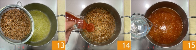 Adicione as lentilhas 13 e misture. Despeje o purê de tomate 14 e a água fria 15.