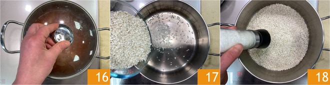 Cubra com a tampa 16 e cozinhe por 25 minutos. Coloque o arroz em outra panela 17 e toste-o a seco por 3-4 minutos. Ajuste o sal 18.