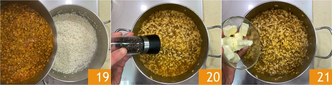 Adicione as lentilhas 19 e cozinhe o arroz; adicionando aos poucos água quente (ou caldo). No final do cozimento, ajuste o sal e a pimenta 20. Desligue o fogo, adicione a manteiga fria 21 e mexa.