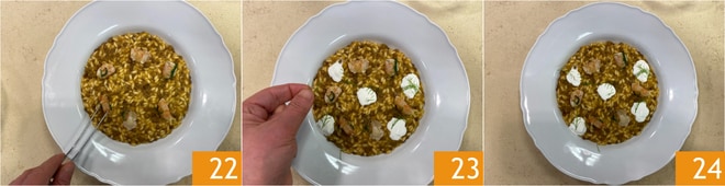 Emprate, na superfície do arroz coloque os camarões marinados 22 e a stracciatella. Complete com o funcho 23. O risoto com lentilhas vermelhas e camarões está pronto para ser degustado 24!