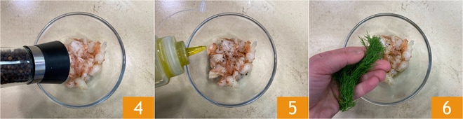 Coloque tudo em uma tigela e tempere com sal, pimenta 4, óleo 5 e funcho 6.