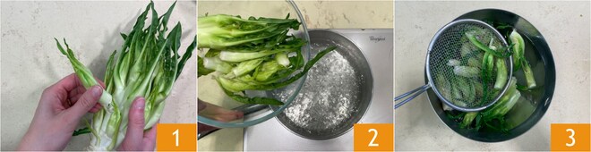 Para preparar o risoto com pecorino e puntarelle, primeiro limpe as puntarelle destacando os brotos da parte central mais dura 1. Escalde-as em água fervente com sal por alguns segundos 2, depois escorra e mergulhe em água gelada ou em uma mistura de água e gelo 3.