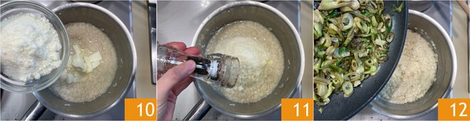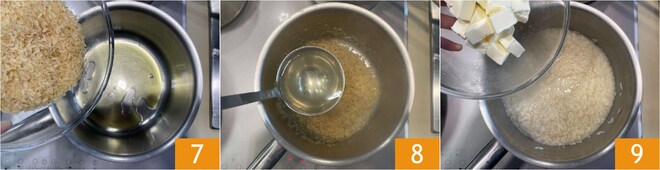 Em uma panela, coloque um fio de azeite, adicione o arroz 7 e toste por alguns minutos, mexendo de vez em quando. Regue com água quente 8 e cozinhe adicionando mais uma concha conforme necessário e mexendo. Ao final do cozimento, desligue o fogo e adicione a manteiga 9.