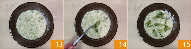 Emprate 13 e complete com algumas puntarelle 14 e uma última pitada de pimenta. Seu risoto com pecorino e puntarelle está pronto para ser saboreado 15!