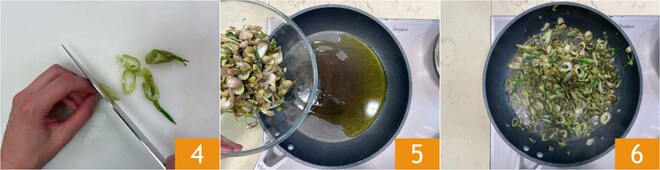 Corte-as em losangos com cerca de 5 mm de espessura 4. Em uma frigideira, aqueça um fio de azeite, adicione as puntarelle 5 e salteie por alguns minutos 6.