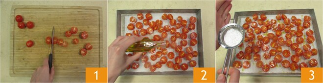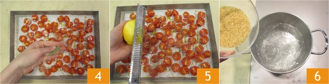 Para preparar o risoto com pesto de espinafre, comece pelos tomatinhos: depois de lavá-los, corte-os ao meio 1 e coloque-os em uma assadeira, tempere com óleo 2, sal, açúcar de confeiteiro 3,