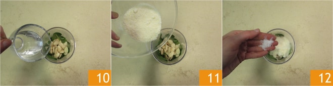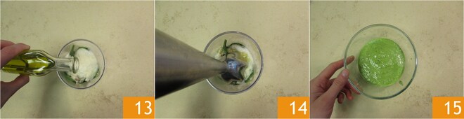 o óleo 13, a pimenta e bata tudo com um mixer de mão 14. Quando o pesto estiver homogêneo, estará pronto, reserve-o 15.