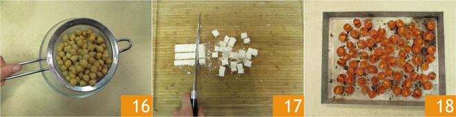 Escorra o grão-de-bico 16 e corte o quartirolo em cubos de aproximadamente 1 cm 17. Enquanto isso, seus tomatinhos estarão cozidos, retire-os do forno 18.