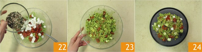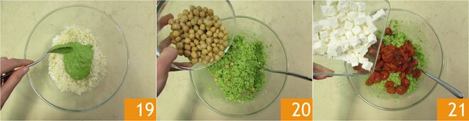 É hora de temperar o arroz, coloque-o em uma tigela grande e adicione o pesto de espinafre 19, misture bem e, se necessário, adicione um fio de óleo. Acrescente o grão-de-bico 20, os tomatinhos confit, o quartirolo 21