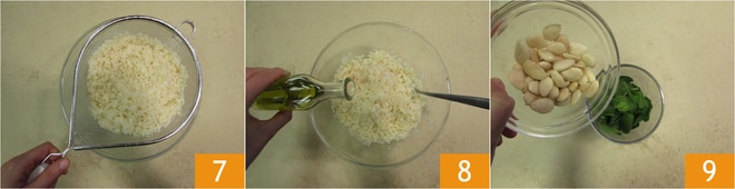 Escorra o arroz 7 e reserve-o em uma tigela com um fio de óleo para não grudar 8. Agora prepare o pesto. Coloque em um recipiente estreito e alto o espinafre, as amêndoas 9,