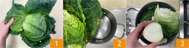 Para preparar o risoto de repolho e linguiça, primeiro prepare o caldo que você usará para cozinhar o arroz: retire as folhas externas do repolho 1 e coloque-as em uma panela cheia de água 2 junto com meia cebola 3, depois leve para ferver em fogo médio.
