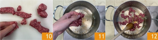 Agora remova a pele da linguiça e esfarele-a com as mãos 10. Coloque a linguiça na mesma panela onde você refogou o repolho 11 e doure em fogo alto por poucos minutos, mexendo frequentemente 12.