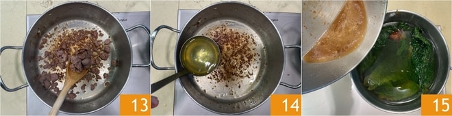 Retire a linguiça dourada da panela 13 e reserve, depois deglace o fundo com uma concha de caldo quente 14 e despeje o líquido obtido na panela com o caldo, para torná-lo ainda mais saboroso 15.