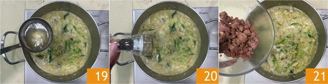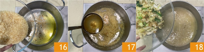 Neste ponto, aqueça um fio de óleo na mesma panela e toste o arroz por alguns minutos 16, depois adicione uma concha de caldo 17 e junte o repolho refogado anteriormente, reservando um pouco para a decoração 18.