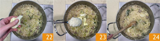 Desligue o fogo e misture com a manteiga 22 e o Parmigiano Reggiano DOP ralado 23, depois mexa bem para misturar 24.