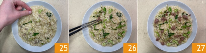 Emprate e decore com o repolho 25 e a linguiça reservada 26. Sirva imediatamente o seu risoto de repolho e linguiça 27!