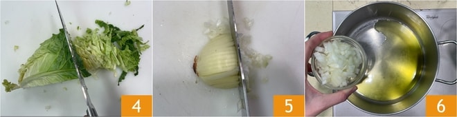 Reduza o restante do repolho em tiras 4, depois corte a outra metade da cebola em brunoise 5. Coloque a cebola em uma panela onde você já aquecida uma quantidade de óleo 6.