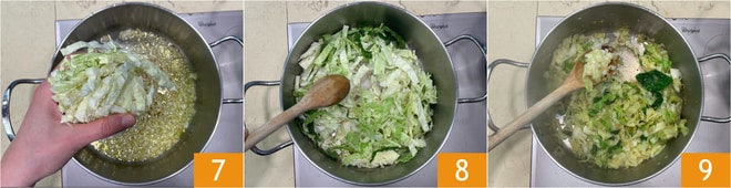 Quando a cebola estiver dourada, adicione as tiras de repolho 7 e refogue em fogo médio-alto por alguns minutos 8. Depois de amolecido, retire o repolho da panela 9 e reserve.