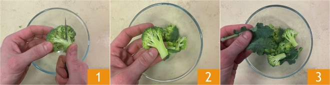 Para preparar o risoto com stracchino, brócolis e anchovas, a primeira coisa a fazer é limpar os brócolis, pegar 4 flores maiores, no total cerca de 100 g 1 e divida ao meio 2. Adicione às flores também as folhas verdes 3.