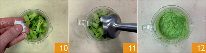Ajuste o sal 10 e bata com um mixer de imersão 11 até obter uma mistura cremosa e homogênea 12 e reserve.