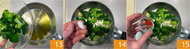 Em uma frigideira aqueça óleo e alho e depois adicione as flores e folhas de brócolis branqueados anteriormente 13. Ajuste o sal 14, acrescente a pimenta vermelha em rodelas 15 e salteie por alguns minutos, reserve.