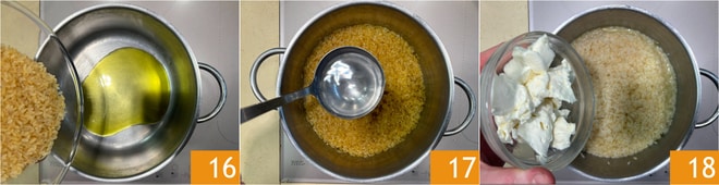 Em uma panela aqueça uma colher de óleo, adicione o arroz 16 e toste, mexendo sempre. Regue com água quente ou caldo de legumes quente 17 até cobrir. Cozinhe o arroz adicionando mais líquido conforme necessário. Quando o arroz estiver cozido, desligue o fogo e adicione o stracchino 18.
