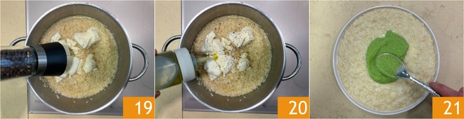 Ajuste o sal e a pimenta 19, adicione um fio de óleo 20 e misture. Sirva o arroz e coloque no centro uma colher de creme de brócolis 21.
