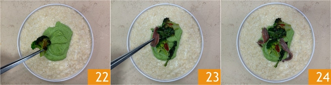 Coloque sobre o creme as flores e as folhas de brócolis salteados na frigideira 22. Complete com os filés de anchovas 23. O risoto com stracchino, brócolis e anchovas está pronto para ser servido 24.