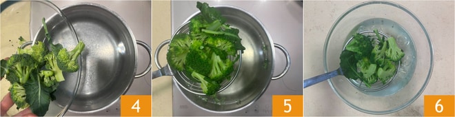 Branqueie por 4 minutos 4, escorra 5 e resfrie em uma tigela com água e gelo 6, escorra novamente e reserve.