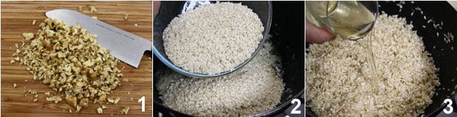 Para preparar o risoto de gorgonzola, peras e nozes, comece preparando um caldo de legumes, Caldo de legumes para ver como fazer. Em seguida, pique grosseiramente as nozes 1 e reserve. Pique finamente o chalota, coloque-o em uma panela com 30 gr de manteiga; deixe murchar e adicione o arroz, toste por alguns minutos 2: adicione o vinho branco e deixe evaporar 3,