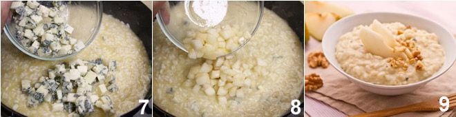 Cerca de 5 minutos antes do risoto estar pronto, adicione o gorgonzola em cubos 7, as peras em cubos e a pera batida 8. Desligue o fogo, adicione o Grana Padano DOP ralado e mexa com a manteiga restante (20 gr). Emprate o arroz e decore com as nozes picadas anteriormente e fatias de pera (se desejar, com lascas de Grana Padano DOP) 9.